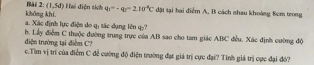 Bài 2: (1,5đ) Hai điện tích q1= - q2= 2.10°C đặt tại hai điểm A, B cách nhau khoảng 8cm trong