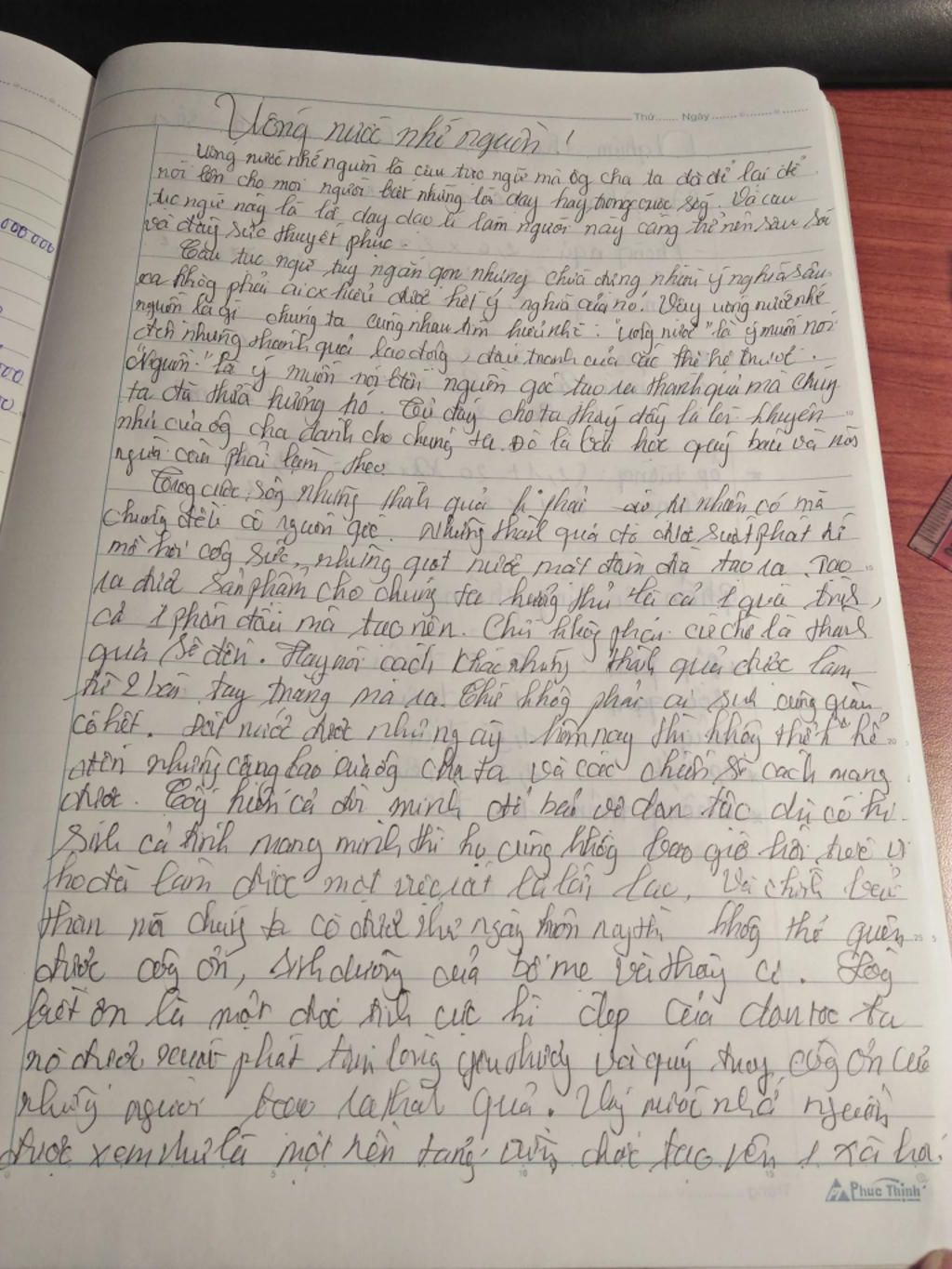 giải thích ý nghĩa : Khi chúng ta hưởng thụ những tinh hoa mà do người khác làm ra ta cần phải nhớ ai đã tạo ra nó và tạo ra nó như thế nào , uống nước nhớ nguồn cũng như z , mỗi khi chúng ta lấy nước để uống, để ăn, để tắm,.. thì chúng ta cần phải biết ơn những nguồn nước lớn đã sản sinh ra những dòng nước nhỏ như thế này để cho chúng ta sinh hoạt hằng ngày giúp ích ta rất nhiều