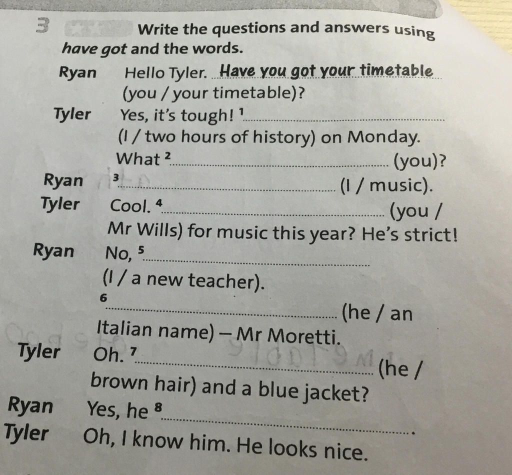 2. I have two hours history on Monday. 3. What about you? 4.I have music 5. you have Mr Wills for music this year? 6.I have a new teacher. He has got an Italian name-Mr Moretti. 7. Has he got brown hair and blue jacket? 8. has