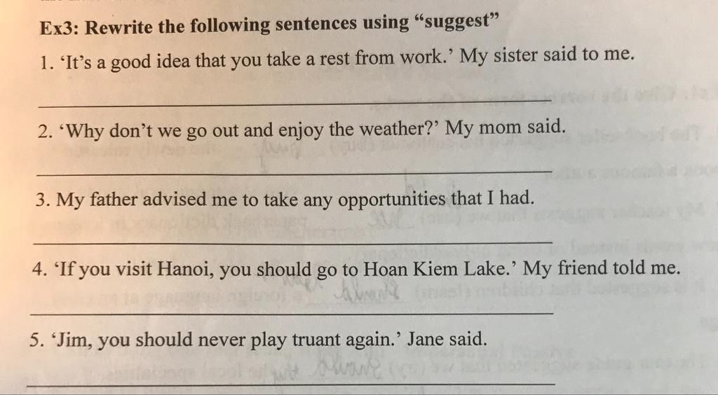 `@` S1 + suggest + S2 (+should) + V-inf : Ai khuyên ai nên làm gì ....