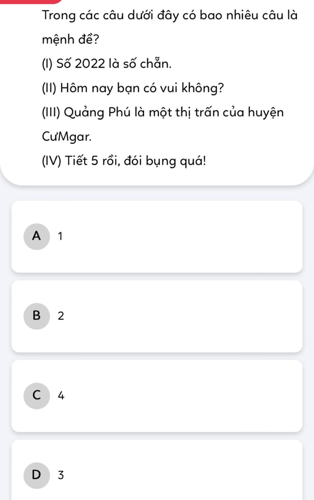Còn lại(I) và (III) ta thấy đều là câu khẳng định nên ta chọn 2 câu này là mệnh đề.