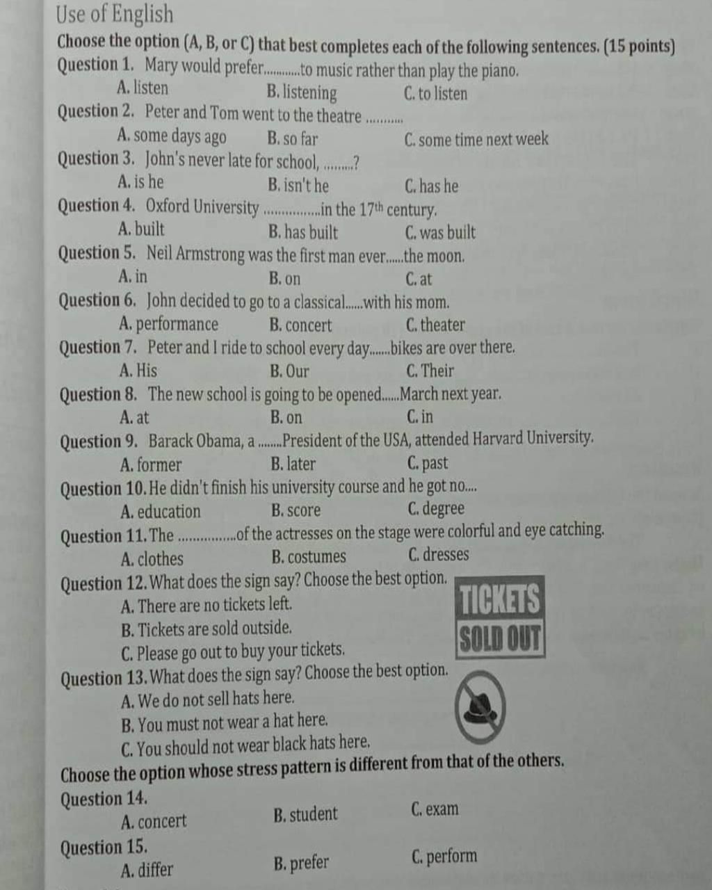 Choose the option (A, B, or C) that best completes each of the following sentences. (15 points)
