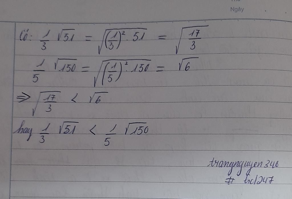 `=> 1/3 sqrt51 < 1/5 sqrt150`