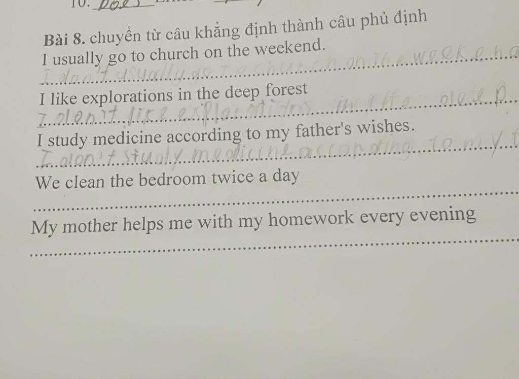 1. 1. I don't usually go to church on the weekend 2. 2. I don't like explorations in the deep forest 3. 3. I don't study medicine according to my father's wishes 4. 4. We don't clean the bedroom twice a day 5. 5. My mother doesn't help me with my homework every evening - Cấu trúc hiện tại đơn: + ĐỘNG TỪ THƯỜNG: (-) He/ she/it/ Danh từ số ít+doesn't+ V_inf I/we/ you/ they/ Danh từ số nhiều+don't+ V_inf Rút gọn1. 1. I don't usually go to church on the weekend 2. 2. I don't like explorations in the deep forest 3. 3. I don't study medicine according to my father's wishes 4. 4. We don't clean the bedroom twice a day 5. 5. My mother doesn't help me with... xem thêm