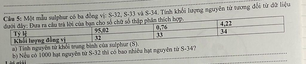Như vậy, cứ 954 nguyên tử ${}_{\rm{}}^{{\rm{32}}}{\rm{S}}$ thì có 46 nguyên tử ${}_{\rm{}}^{{\rm{34}}}{\rm{S}}$