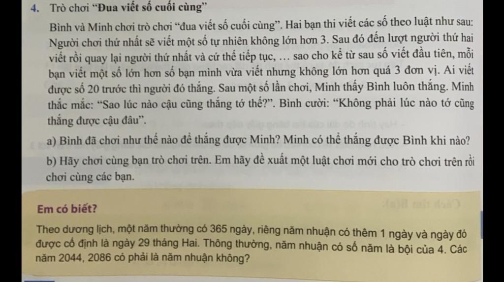 `a)` Bình đã áp dụng cách tìm bội của một số để để thắng được Minh. Cụ thể là Bình đã áp dụng để tính các bội của `3` rồi viết lần lượt các bội của `3` khi chơi trò chơi với Minh.