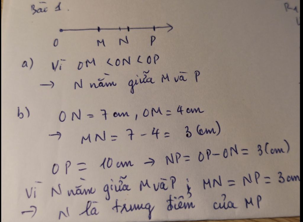 a) Trên tia Ox ta có: OM<ON<OP(4cm<7cm<10cm) nên N nằm giữa M và P.(1)