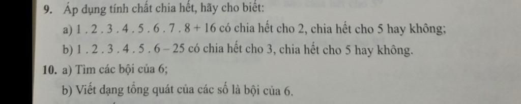 Bài 9 câu a : chia hết cho 2 ; ko chia hết cho 5 đúng ko Câu b ko chia hết cho 3 nhưng chia hết cho 5 đúng ko