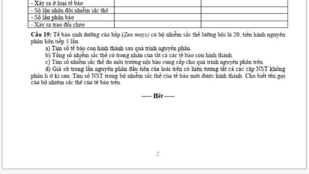 - Giả sử trong lần nguyên phân đầu tiên của loài trên có hiện tượng tất cả các cặp NST không phân li ở kì sau thì bộ NST của tế bào được hình thành là bộ NST tứ bội (4n = 40)