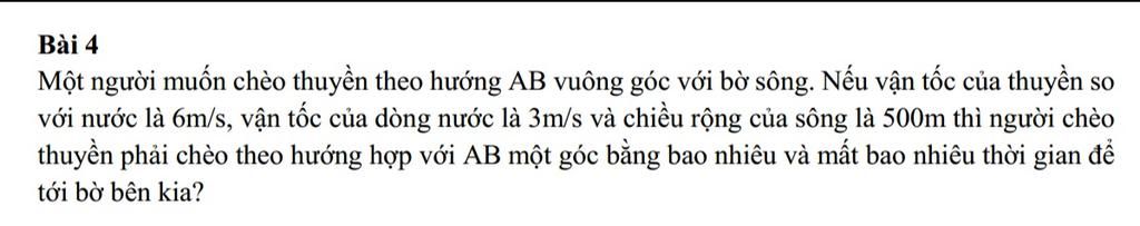 Gọi \(\alpha \) là góc hợp tạo bởi phương chuyển động của thuyền và phương vuông góc với bờ.