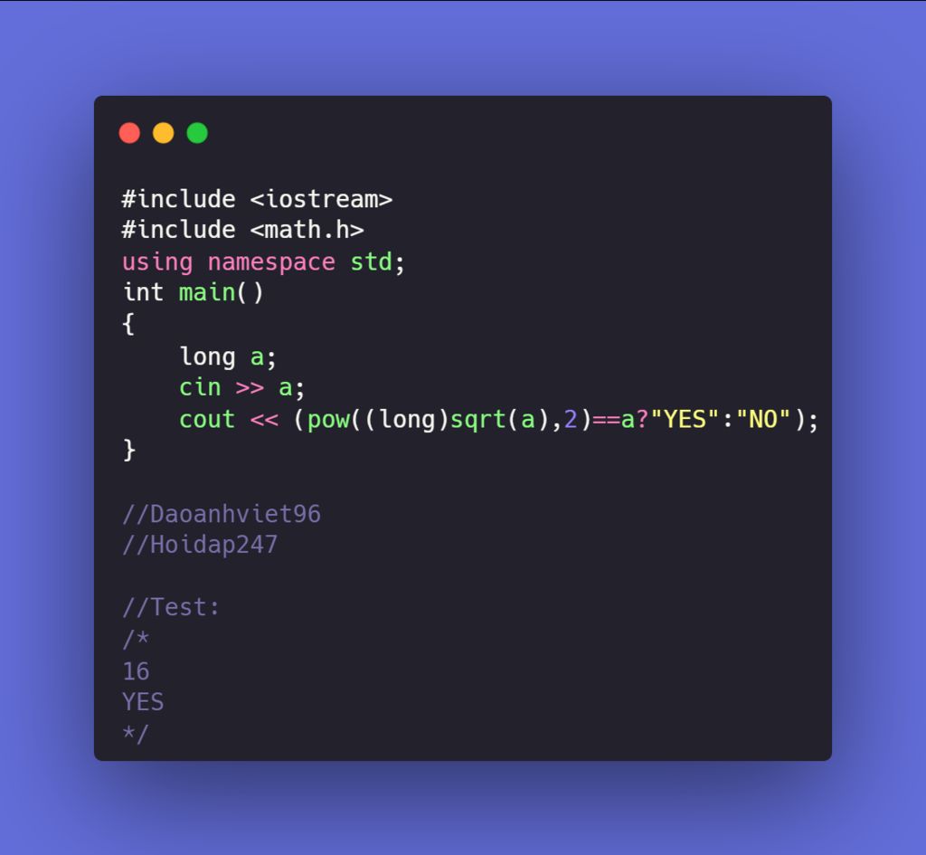 #include <iostream> #include <math.h> using namespace std; int main() { long a; cin >> a; if (pow((long)sqrt(a),2)==a) cout << "YES"; else cout << "NO"; }