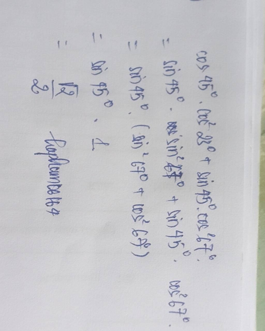 $=sin45^o(sin^267^o+cos^267^o)$