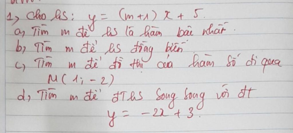 Vậy `m\ne-1` thì hàm số trên là hàm số bậc nhất
