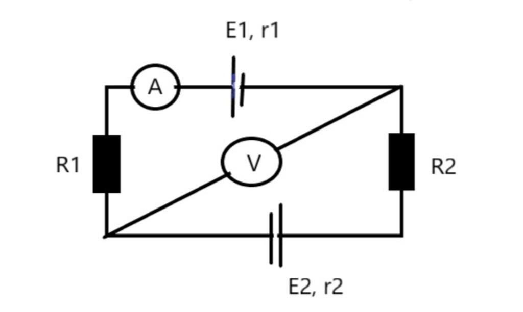 Giả sử `A` là điểm nằm giữa `R_1` và cực (-) nguồn `E_2`, `B` là điểm nằm giữa cực (-) nguồn `E_1` và `R_2`