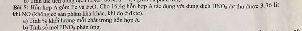 $a,\\ n_{NO}=\dfrac{3,36}{22,4}=0,15(mol)\\ Đặt\ \begin{cases}n_{Fe}=x(mol)\\n_{FeO}=y(mol)\end{cases}\\ \to 56x+72y=16,4\ (1)\\ Fe+4HNO_3\to Fe(NO_3)_3+2H_2O+NO\\ 3FeO+10HNO_3\to 3Fe(NO_3)_3+5H_2O+NO\\ n_{NO}=n_{Fe}+\dfrac{1}{3}.n_{FeO}=x+\dfrac{1}{3}y(mol)\\ \to x+\dfrac{1}{3}y=0,15\ (2)\\ \xrightarrow{\text{Từ (1),(2)}}\begin{cases}x=0,1\\y=0,15\end{cases}\\ \to \%m_{Fe}=\dfrac{0,1.56}{16,4}.100\%=34,15\%\\ \to \%m_{FeO}=\dfrac{0,15.72}{16,4}.100\%=65,85\%\\ b,\\ n_{HNO_3}=4.n_{Fe}+\dfrac{10}{3}.n_{FeO}\\ =0,9(mol)$