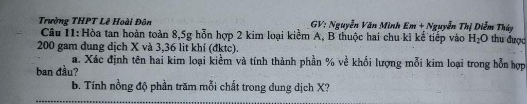 Vì 2 kim loại kiềm thuộc hai chu kỳ liên tiếp nên 2 kim loại thỏa mãn là Na (a mol) và K (b mol).
