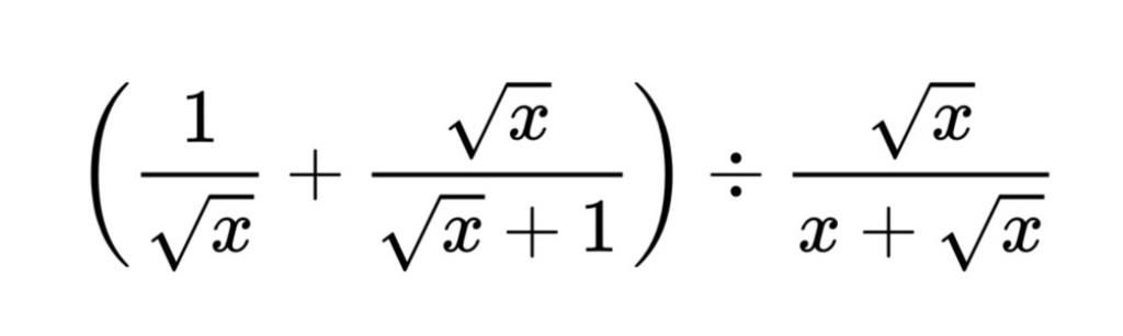 `=((\sqrt{x}+1)/(\sqrt{x}(\sqrt{x}+1))+x/(\sqrt{x}(\sqrt{x}+1))):(\sqrt{x})/(\sqrt{x}(\sqrt{x}+1))`