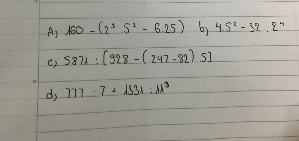`a) 160 - (2^3 . 5^2 - 6 . 25)`