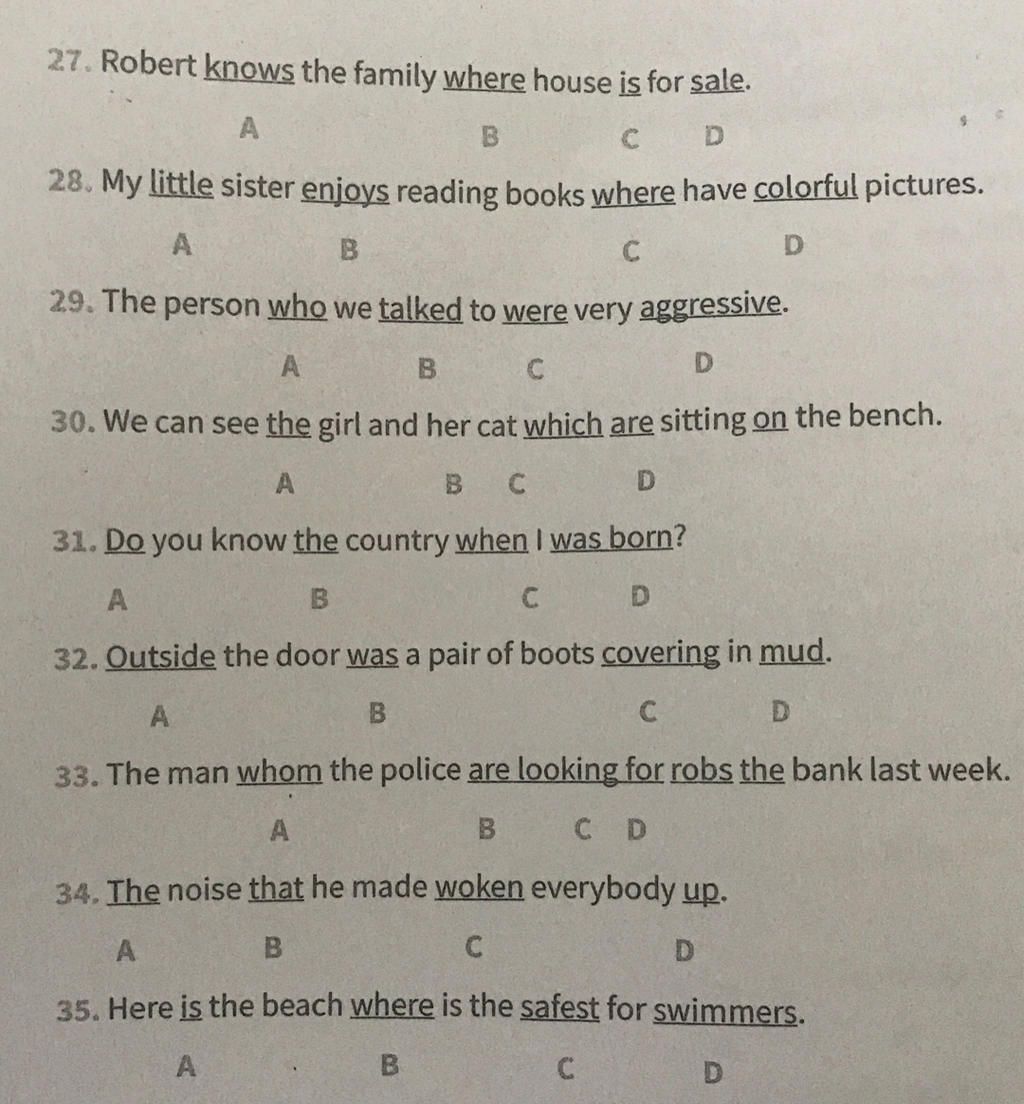 Mark the letter A, B, C or D on your answer sheet to indicate the underlined part that needs correction in each of the following questions.