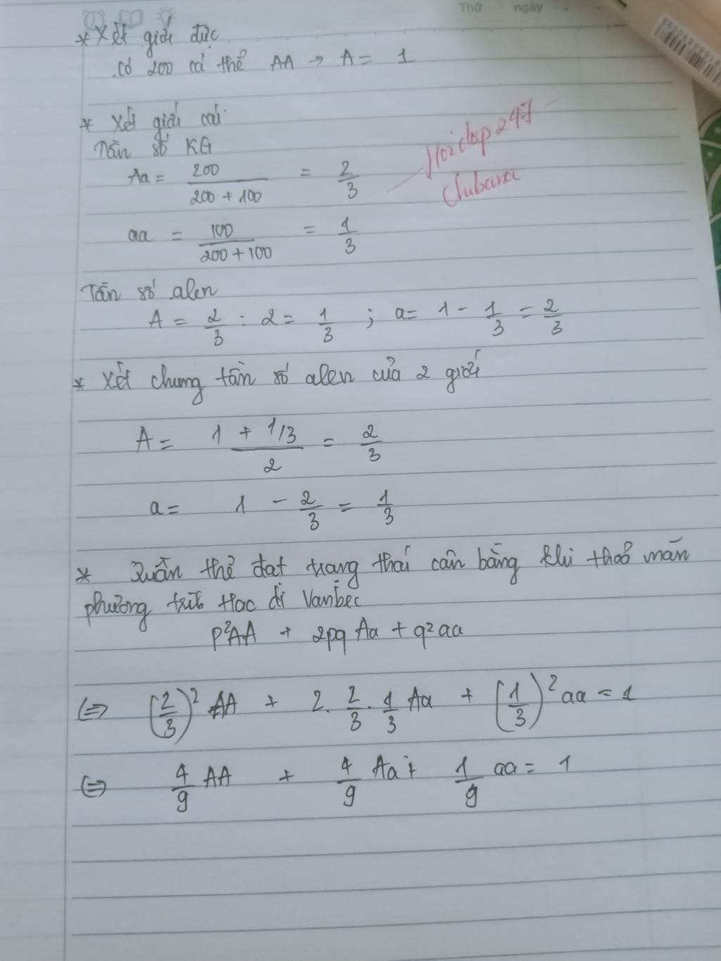 Ở giới cái có 200 Aa, 100 aa → 2/3Aa : 1/3aa.
