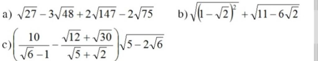 c) $\left(\dfrac{10}{\sqrt{6}-1}-\dfrac{\sqrt{12}+\sqrt{30}}{\sqrt{5}+\sqrt{2}}\right).\sqrt{5-2\sqrt{6}}=5\sqrt{2}-4\sqrt{3}$