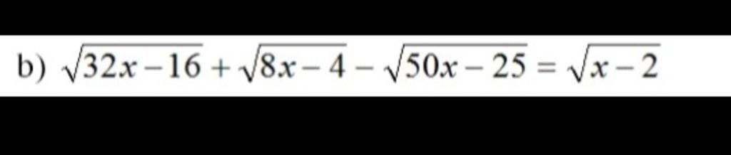 `\sqrt{32x-16} + \sqrt{8x-4} - \sqrt{50x-25} = \sqrt{x-2}`` (x >= 2)`