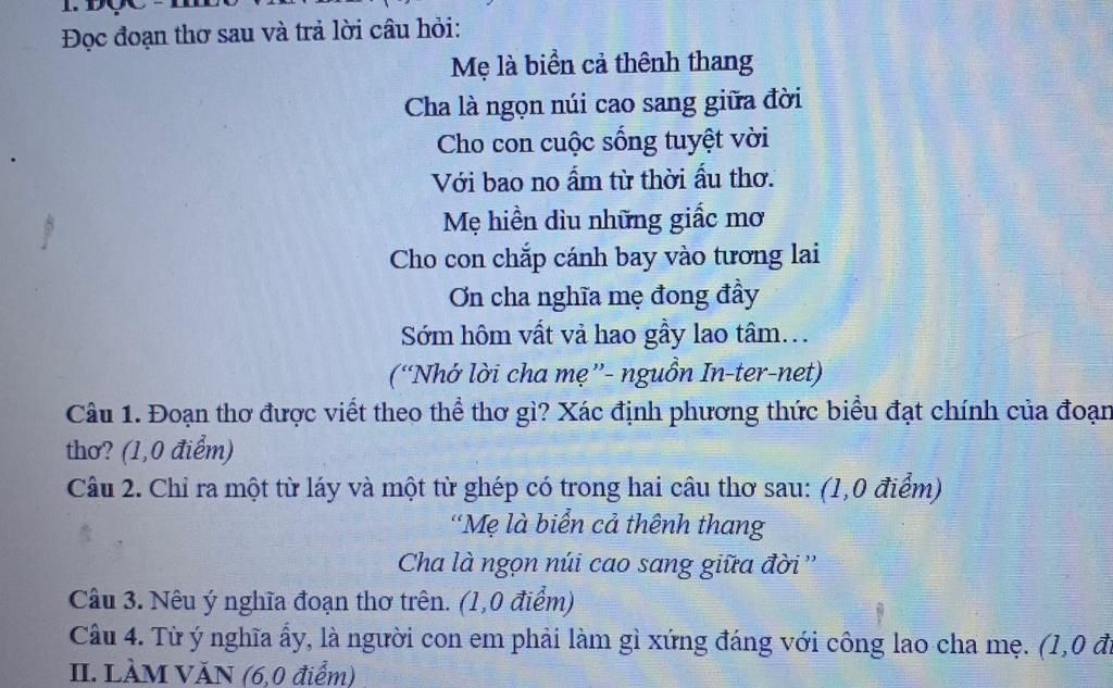 Đoạn thơ trên nói về tình cảm cha mẹ, về những điều tốt đẹp mà cha mẹ cho con, về những gánh nặng mà cha mẹ lặng lẽ hi sinh cho người con.