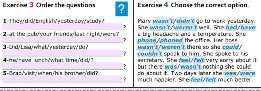 Mary didn't go to work yesterday. She wasn't well. She had a big headache and a temperature. She phoned the office. Her boss wasn't there so she couldn't speak to him. She spoke to his secretary. She felt sorry about it but there was nothing she could do about it. Two days later she was much happier. She felt much better.