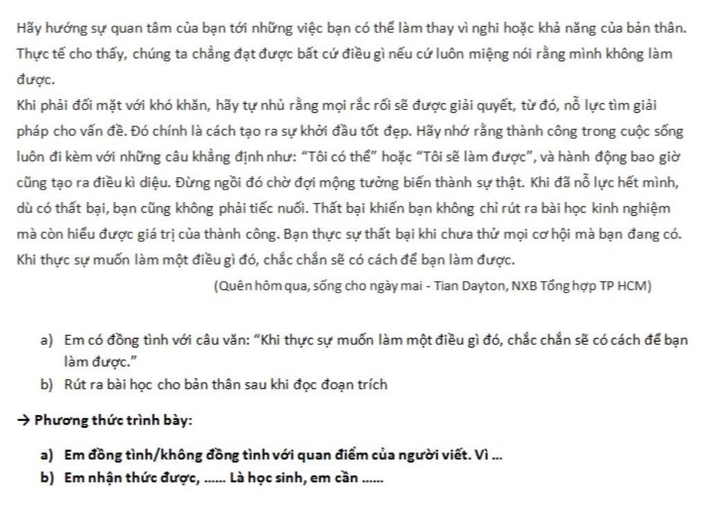 a.Em đồng tình với quan điểm của người viết. Vì ông cha đã có đâu "Không có việc ì khó, chỉ sợ lòng không bền" để khẳng định mọi việc trên đời đều có thể làm và đều có cách giải quyết. Chỉ cần chúng ta có quyết tâm, sự cố gắng, thực sự muốn thực hiện thì chắc chắn sẽ tìm được cách để thực hiện điều đó.