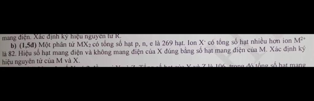 b) (1,5đ) Một phân tử MX2 có tổng số hạt p, n, e là 269 hạt. Ion X- có tổng số hạt nhiều hơn ion M2+