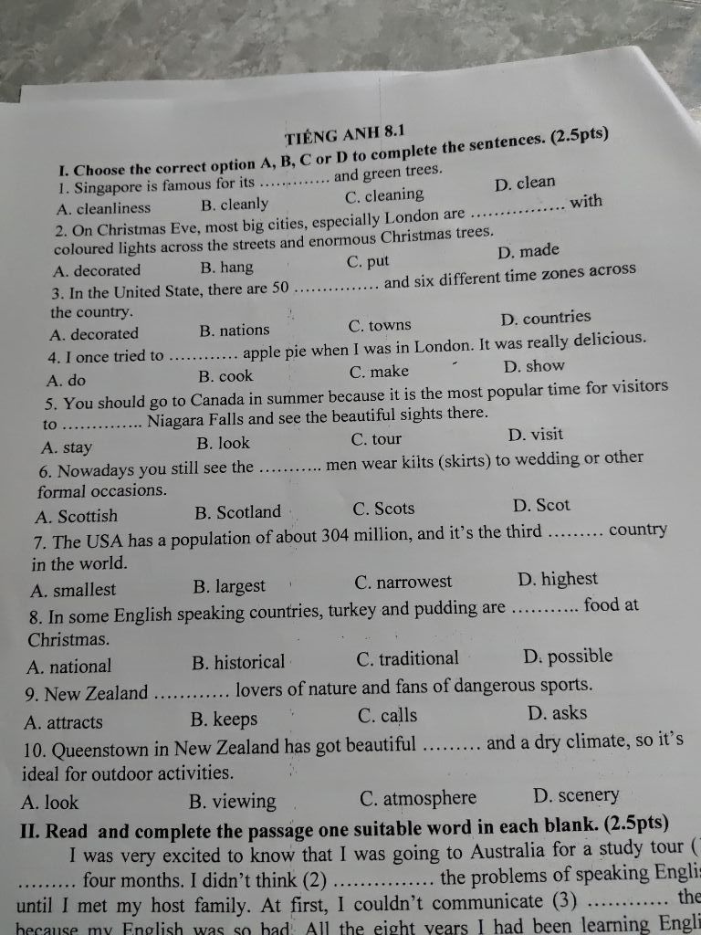 1. Choose the correct option A, B, C or D to complete the sentences. (2.5pts)