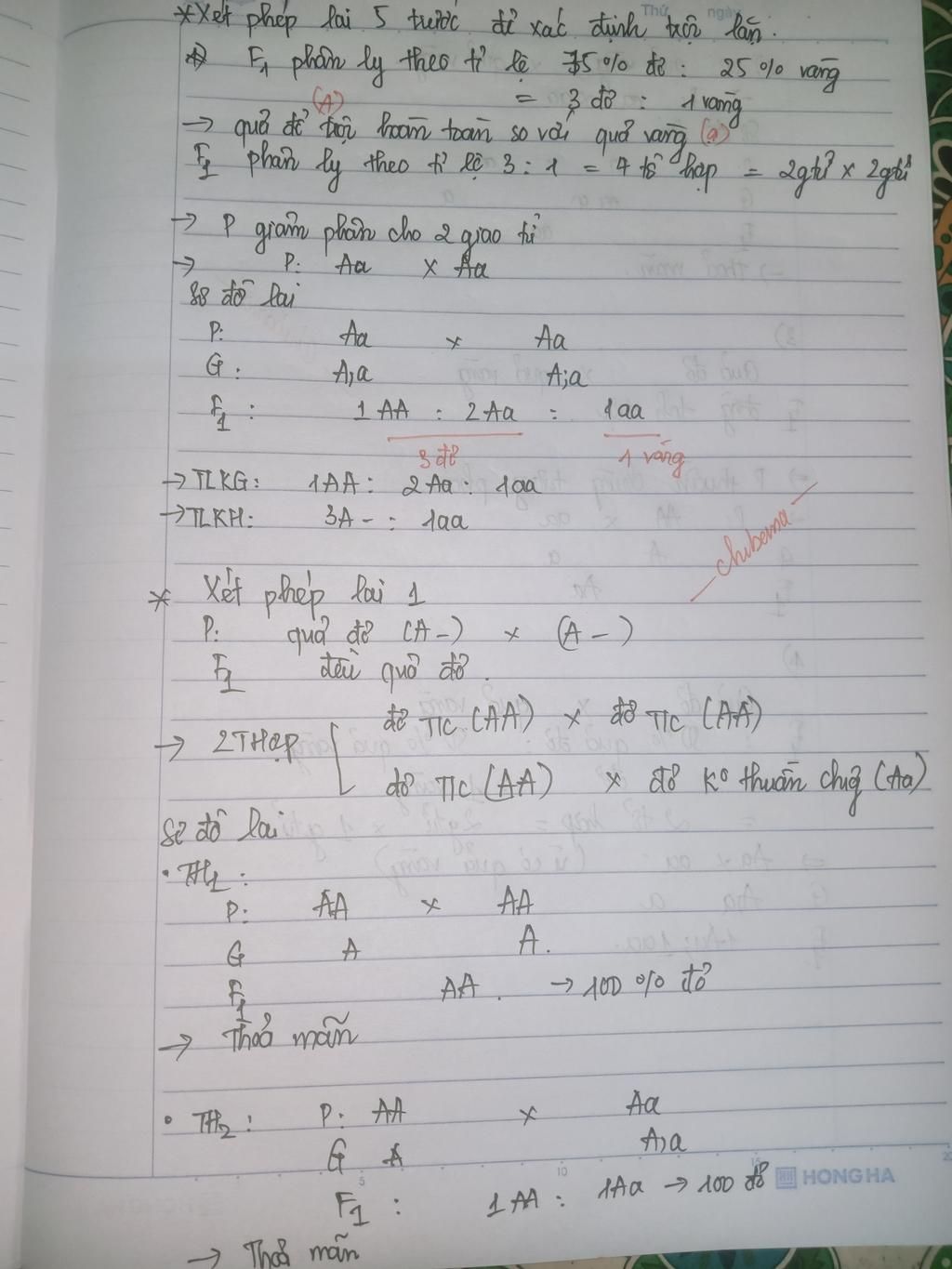 $\dfrac{\text{Quả đỏ}}{\text{Quả vàng}}=$$\dfrac{\text{75%}}{\text{25%}}=$$\dfrac{3}{1}=$ $\text{4 tổ hợp = 2 giao tử x 2 giao tử}$