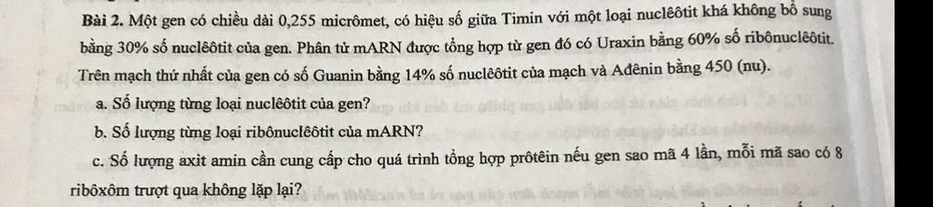 b) Tổng số ribonu của mARN :$rN=\dfrac{N}{2}=$$\dfrac{1500}{2}=750$ $\text{ (nu)}$