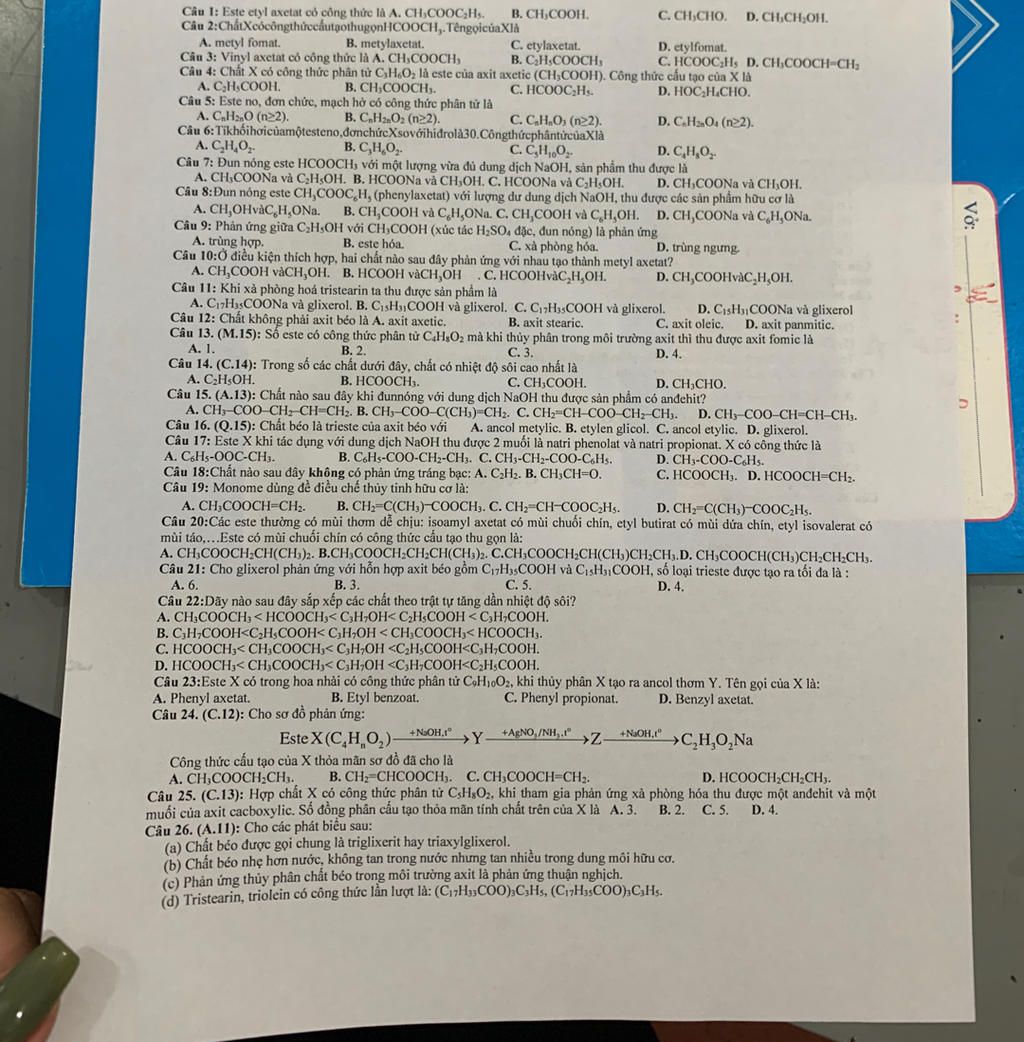 Câu I: Este etyl axetat có công thức là A. CH.COOCHs.