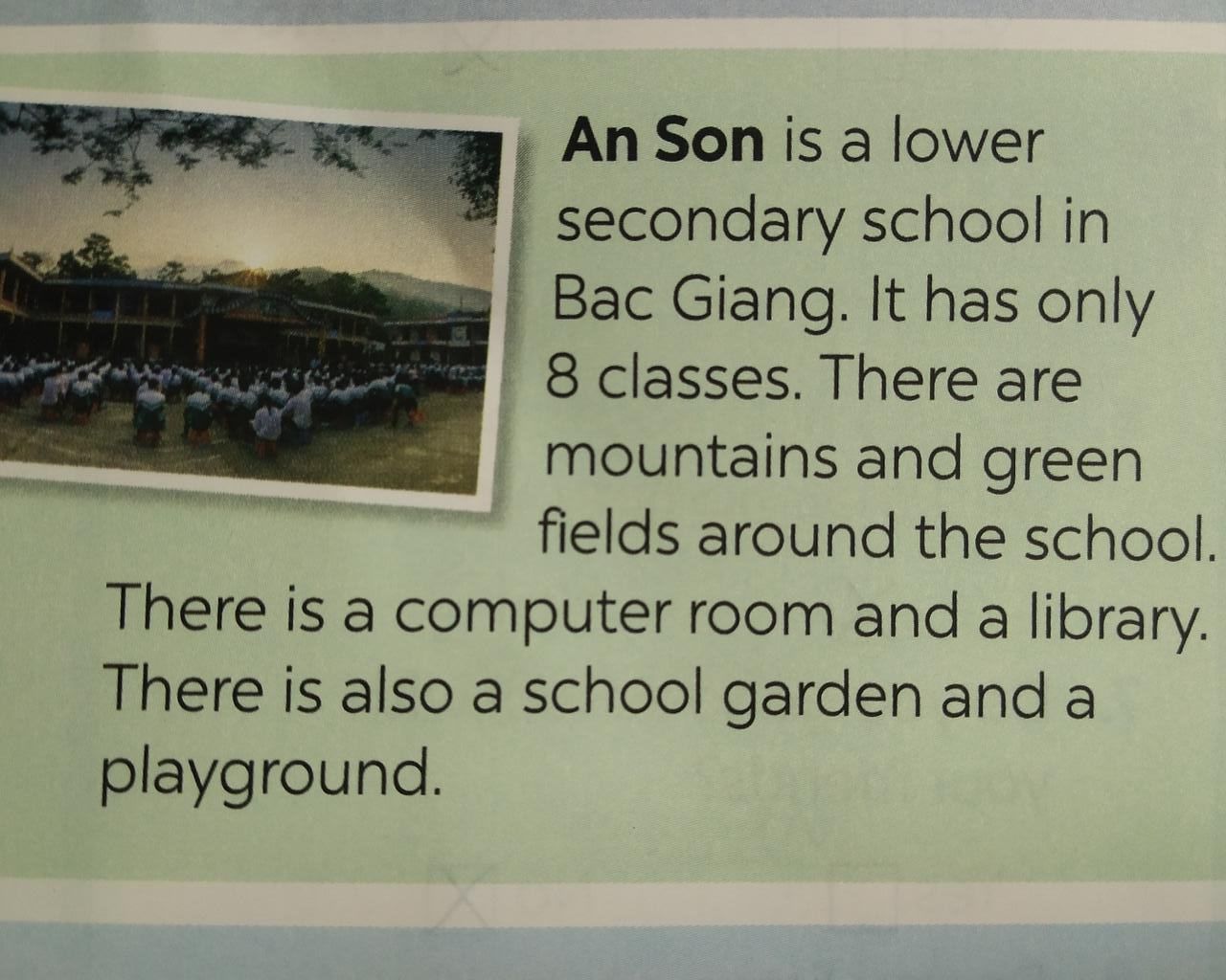 ⇒ Tạm dịch : An Sơn là 1 trong những Trường trung học cơ sở tại Bắc Giang . Ngôi trường này chỉ có duy nhất 8 phòng học . Có khá nhiều ngọn núi và những cánh đồng bao quanh ngôi trường . Ở đây , chỉ có 1 phòng máy tính và 1 cái thư viện . Nó cũng có 1 khu vườn trường và 1 sân chơi .