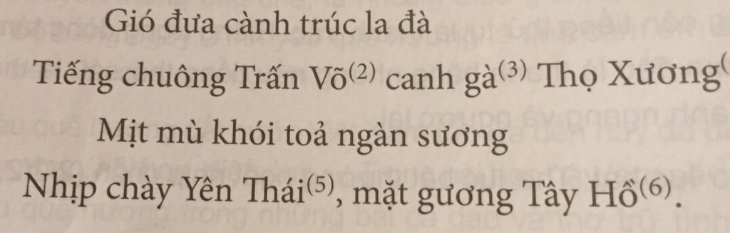 ` @ ` Danh từ: gió, cành trúc, tiếng chuông, Trấn Võ, canh gà, Thọ Xương, khói, sương, nhịp chày, Yên Thái, mặt gương, Tây Hồ.
