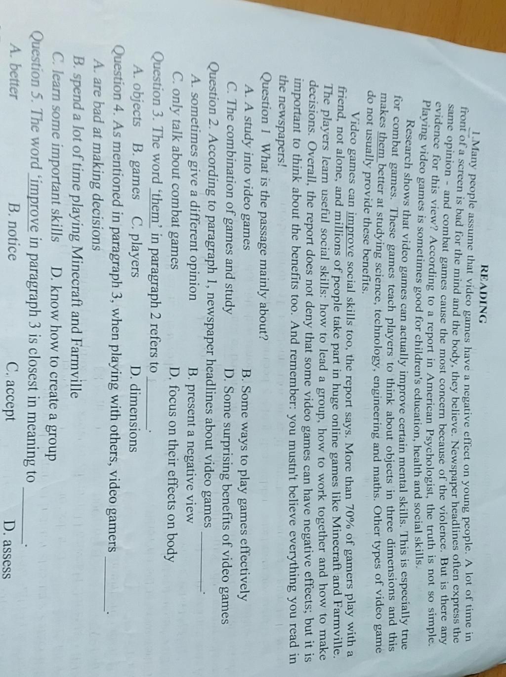 1. D (Many people assume that video games have a negative effect on young people...newspapers!)