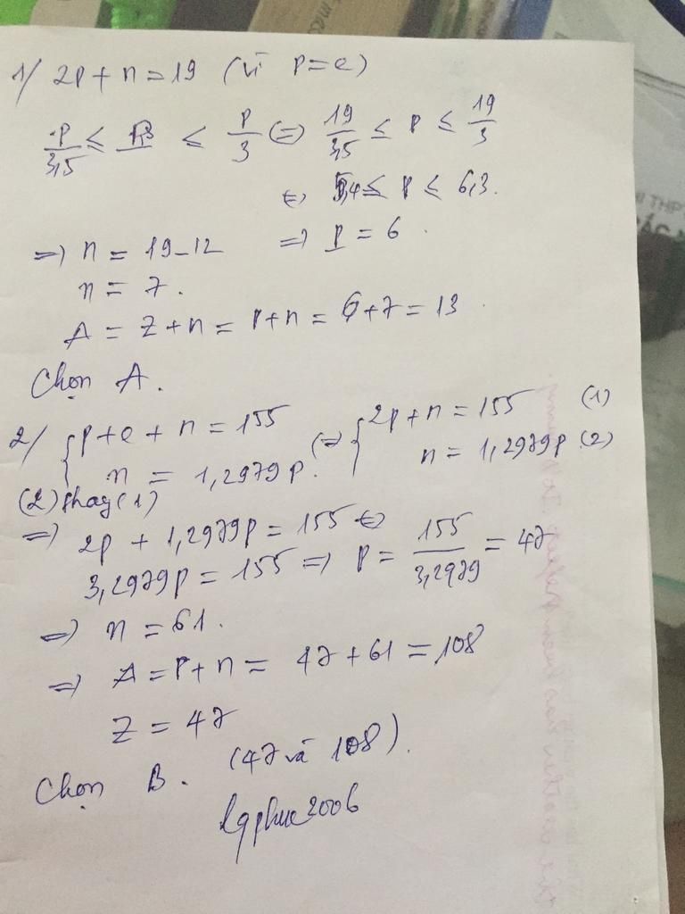 2. Nguyên tử nguyên tố R có tổng các loại hạt cơ bản là 155 hạt. Trong hạt nhân nguyên tử R, số hạt không mang điện lớn gấp 1,2979 lần số hạt mang điện. Số hiệu nguyên tử và số khối của R lần lượt là: