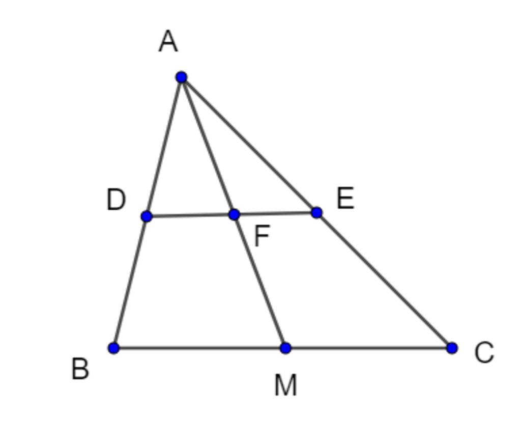 `D` là trung điểm của `AB; F` là trung điểm của `AM`