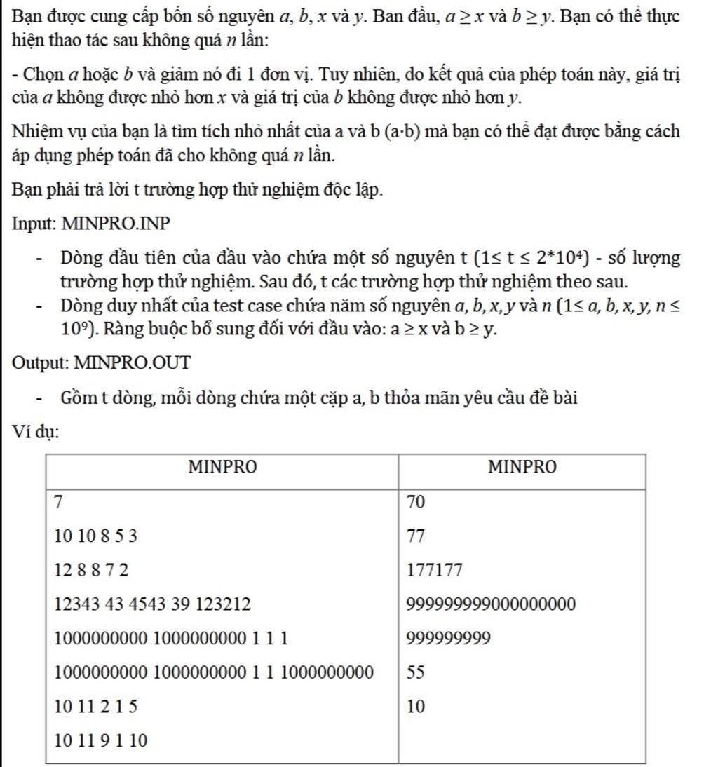 Bạn được cung cấp bốn số nguyên a, b, x và y. Ban đầu, a ≥x và b ≥y. Bạn có thể thực