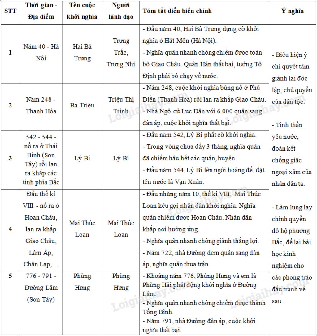 3. Lập bảng thống kê các cuộc khởi nghĩa lớn trong thời Bắc thuộc.