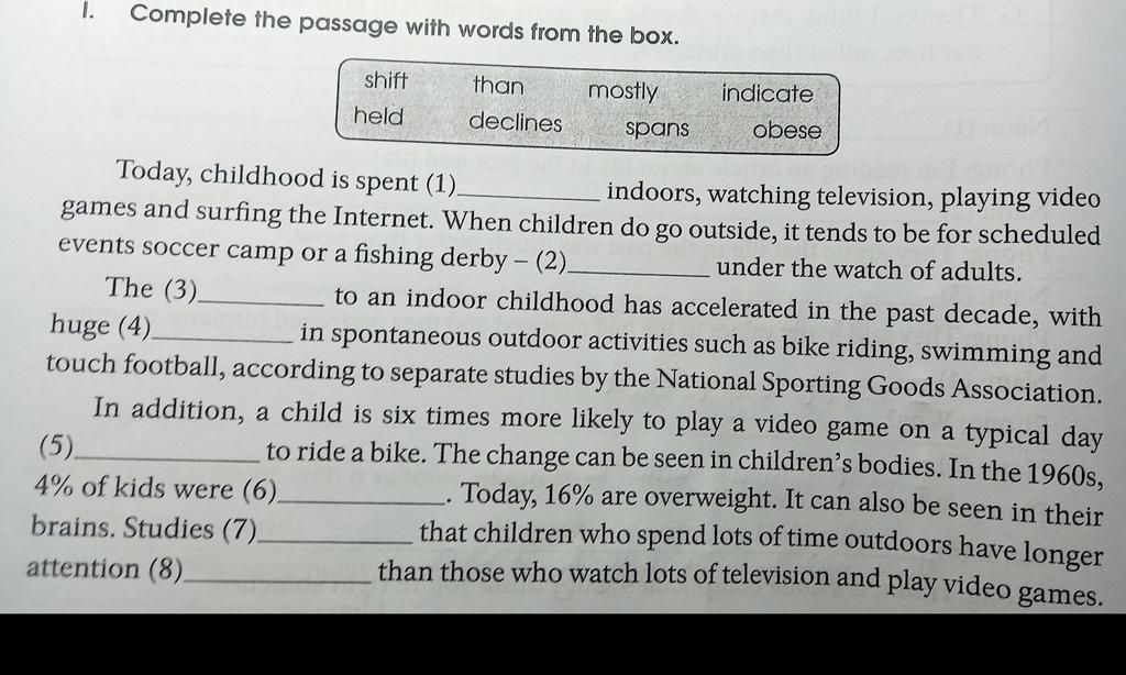 In addition, a child is six times more likely to play a video game on a typical day than ( more than - ss hơn) to ride a bike. The change can be seen in children’s bodies. In the 1960s, 4% of kids were obese ( thừa cân, béo phì). Today, 16% are overweight. It can also be seen in their brains. Studies indicate ( Chỉ ra, ở đây là các nghiên cứu chỉ ra) that children who spend lots of time outdoors have longer attention spans ( sự tập trung kéo dài..) than those who watch lots of television and Play video games