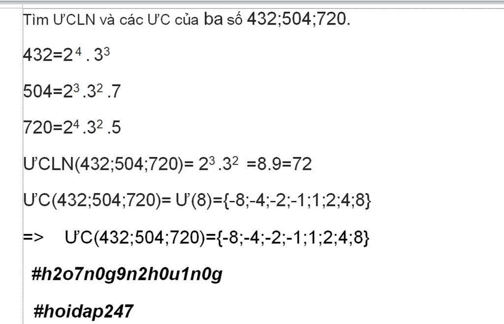 `=> Ư C(432 ; 504 ; 720) = {1 ; 2 ; 4 ; 6 ; 12 ; 18 ; 36 ; 72}`
