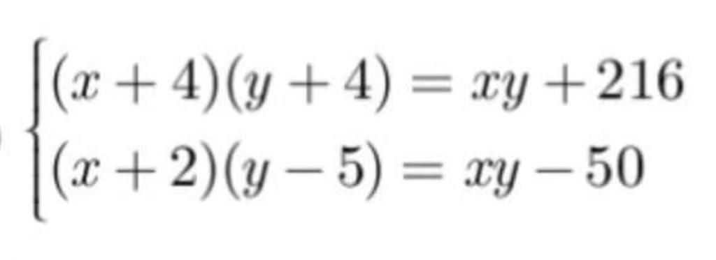 $\bullet$ $\begin{cases} (x+4)(y+4) = xy + 216 \\ (x+2)(y-5) = xy -50\\ \end{cases}$