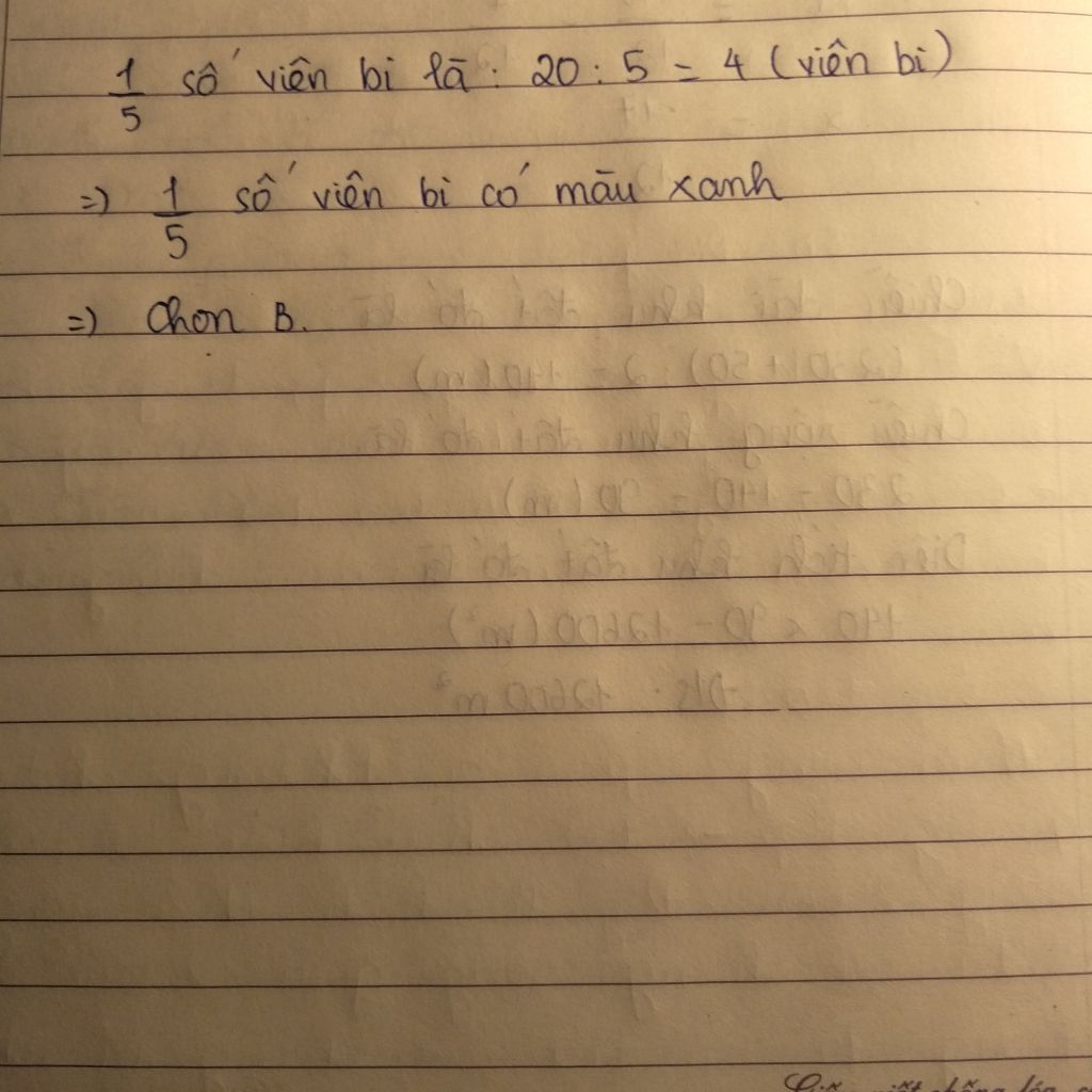 Có 20 viên bi, trong đó có, 3 viên bi nâu, 4 viên bi xanh, 5 viên bi đỏ, 8 viên bi vàng. Như vậy 1/5 số bi có màu: