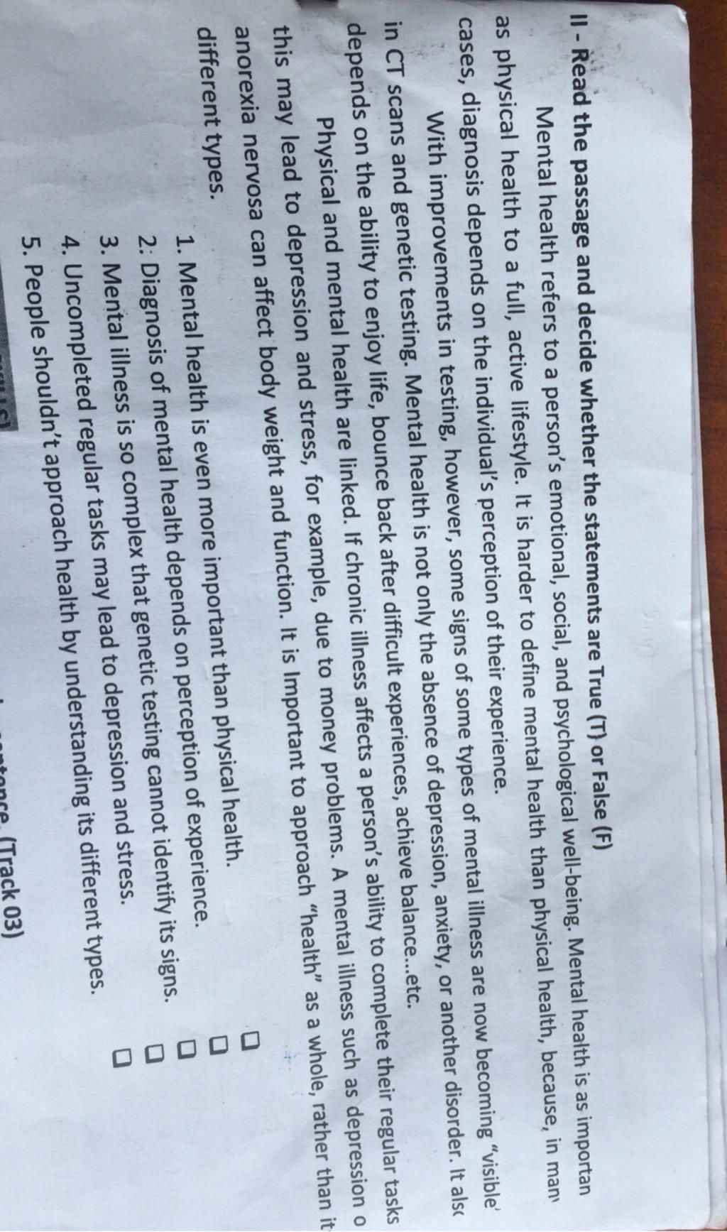 Do có câu "Mental health is as important as physical to a full, active lifestyle." (Sức khỏe tinh thần cũng quan trọng như thể chất đối với một lối sống năng động, đầy đủ.) mà câu đề cho là "Sức khỏe tinh thần quan trọng hơn thể chất" nên là false nha