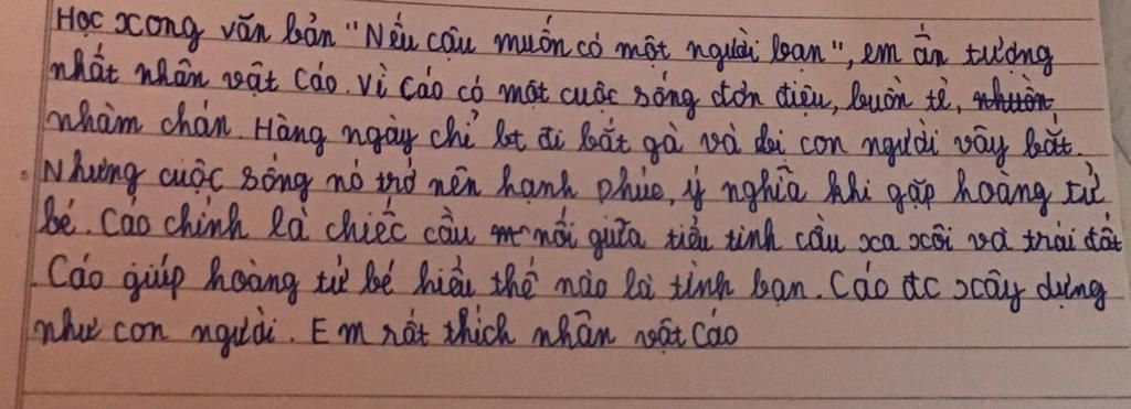 Khi đọc đoạn trích Nếu cậu muốn có một người bạn em cảm thấy rất ấn tượng với nhân vật cáo. Khi vừa đến Trái Đất, hoàng tử bé nhìn thấy một vườn hoa hồng rực rỡ và nhận ra rằng ở hành tinh của mình, cậu chỉ có một bông hoa tầm thường. Phát hiện này khiến cậu buồn bã, thất vọng, nằm dài tên cỏ và khóc. Đúng lúc đó thì một con cáo xuất hiện. Nó nói rằng cảm thấy cuộc sống của mình thật đơn điệu: Mình săn gà, con người săn mình. Mọi con gà đều giống nhau, mọi con người đều giống nhau. Cho nên mình hơi chán, bởi vậy mà mong muốn được cảm hóa: Bạn làm ơn hãy cảm hóa mình đi. Và rồi cáo đã giúp hoàng tử bé hiểu được thế nào là cảm hóa - hay cũng chính thế nào là tình bạn. Cáo được xây dựng giống như một con người - biết trò chuyện, có cảm xúc và suy nghĩ. Với nhân vật này, nhà văn đã gửi gắm cho người đọc hiểu được giá trị của tình bạn.