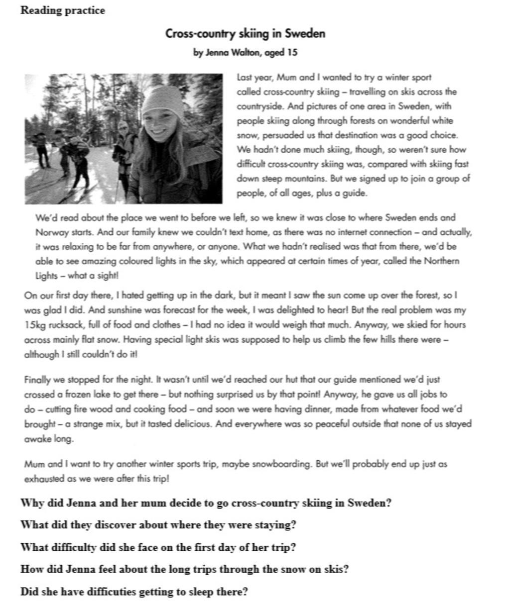 ` bb3. -> ` Jenna had to get up in the dark, which she didn’t like, and she had a 15kg rucksack full of food and clothes, which she had no idea would weigh that much. She also found it difficult to ski uphill, even with the special skis.