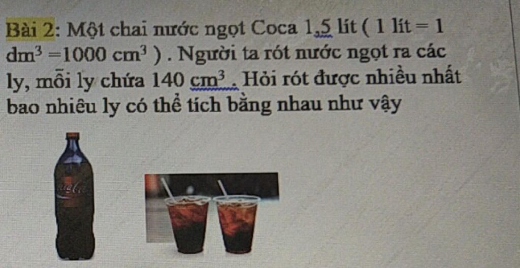 Vậy rót được nhiều nhất `10` ly có thể tích `140 cm^3` và còn thừa `100 cm^3`