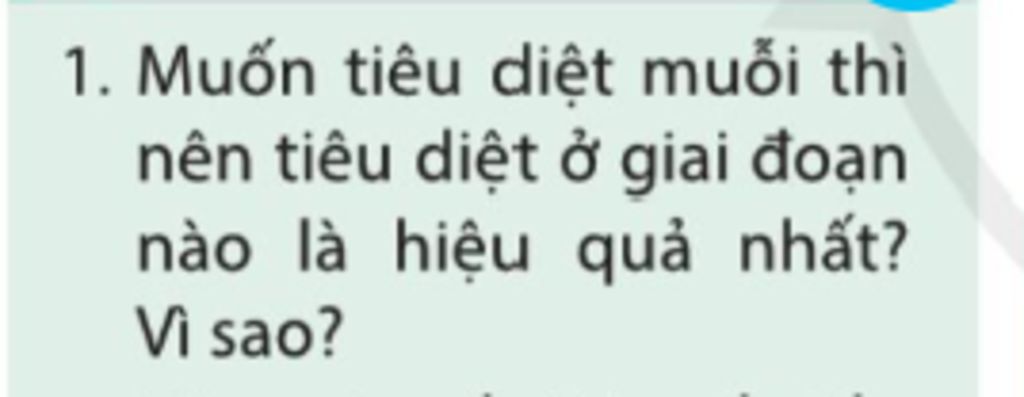 * Muốn tiêu diệt mỗi thì tiêu diệt ở giai đoạn hình thành loăng quăng, bọ gậy và giai đoạn muỗi trưởng thành vì đây là 2 giai đoạn có thể phát hiện chúng dễ dàng, khu vực ẩn nấp ổn định và thời gian tồn tại lâu.